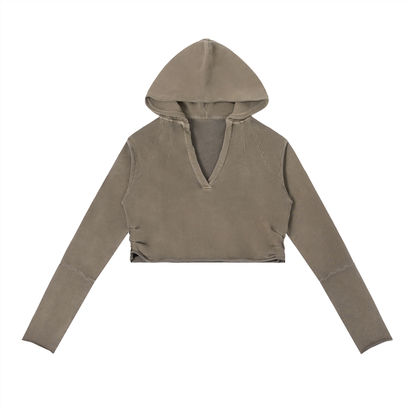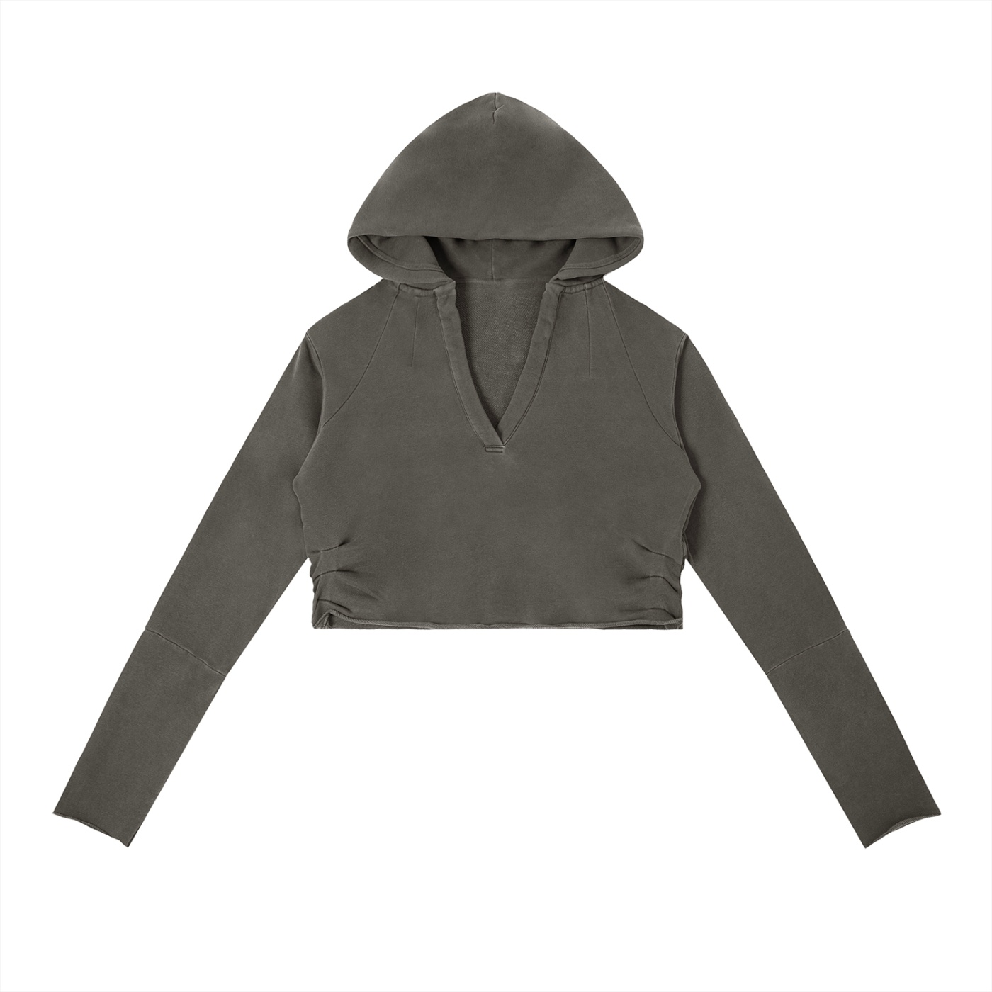 Cut in a bodycon silhouette with a flattering V-neckline and gathered accent details, it sits at the intersection of feminine and street. The drop shoulder sleeve and full hood bring a relaxed, oversized energy that balances the closer-cut body — structured where it counts, effortless everywhere else.